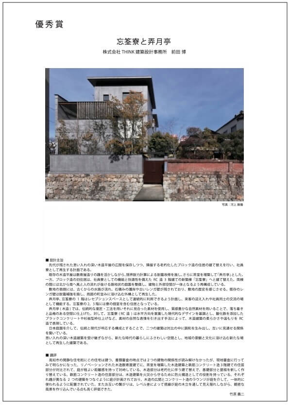 「忘筌寮と弄月亭」が第9回高知県建築文化賞 優秀賞、職人賞を受賞しましたこの度、弊社が設計監理をさせていただいた「忘筌寮と弄月亭(ぼうせんりょう と ろうげつてい)」が、第9回 高知県建築文化賞の優秀賞および職人賞(造園担当:有限会社 グリーンランド)を受賞しました。