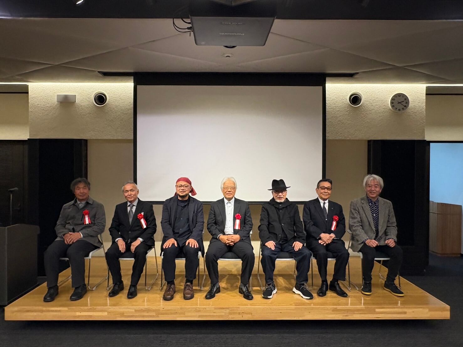 左から:(有)グリーンランド 山本さん(造園)/ (株)猪野工務店 猪野さん(木造施工)/審査委員 渡辺さん/(株)THINK建築設計事務所 所長 山本(設計監理)/審査委員長 竹原義二さん/旭ブロック建設(株)寺尾社長(施工)/審査委員 内野さん